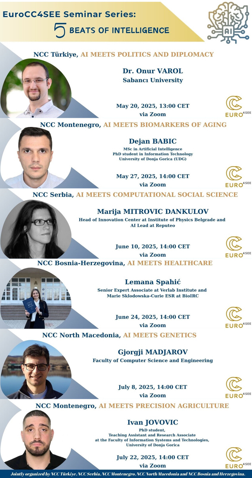 Between May and July 2025, our team partnered with colleagues from the Türkiye, Montenegro, North Macedonia, and Bosnia and Herzegovina national competence centers to organize an online seminar series called 5 Beats of Intelligence: AI Meets Diverse Domains. All the session recordings and presentations are available online. We invite everyone to view these informative recordings to learn about recent AI advancements across different sectors and to stay informed about innovative methods shared by regional specialists.